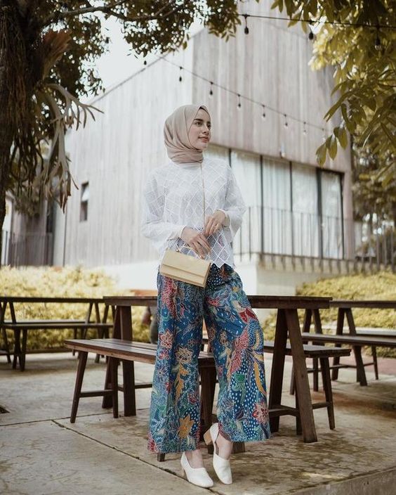 3. Pakai celana kulot batik. Sementara, untuk Anda yang berhijab, bisa memadukan blus simpel dengan celana kulot panjang bermotif batik untuk kesan anggun dan awet muda. Ya, karena celana kulot selalu abadi dan tak lekang termakan zaman.
